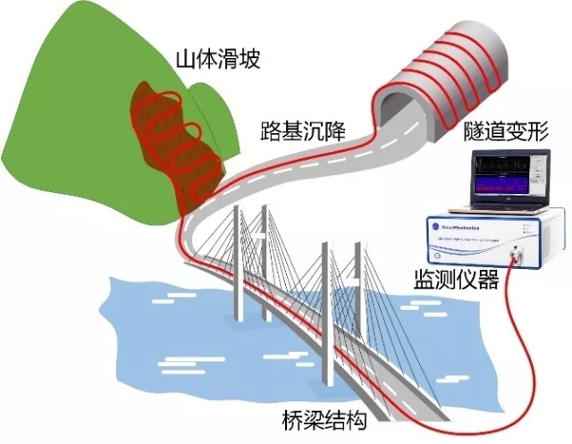 應(yīng)用領(lǐng)域包括:石油天然氣管道和存儲罐的溫度和變形監(jiān)測,海底或陸地高壓電纜/光纜的溫度和應(yīng)變監(jiān)測,地質(zhì)災害(比如山體滑坡、泥石流等)的分布式監(jiān)測,橋梁、大壩和隧道等大型建筑物的結(jié)構(gòu)健康監(jiān)測,飛行器和航天器的飛行狀態(tài)監(jiān)測以及火災報警等。