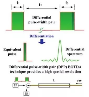 針對這一問題,我們提出并發(fā)展了差分脈沖對布里淵光時域分析技術(shù)(DPP-BOTDA),如圖3所示。該技術(shù)使用脈寬大于聲子壽命的一對脈沖進行差分解析,有效克服了傳統(tǒng)窄脈沖導致的信噪比劣化和光譜展寬的問題,突破了聲子壽命對傳統(tǒng)布里淵傳感在空間分辨率上的限制,實現(xiàn)了2 cm的超高空間分辨率。
