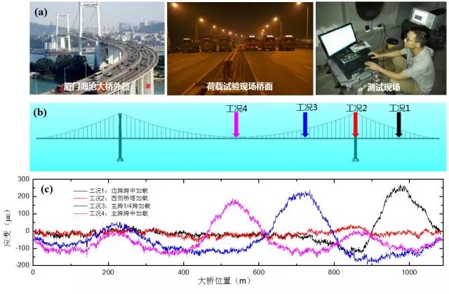 采用本課題組自主研發(fā)的分布式布里淵光纖傳感分析儀對各種工況下的大橋整體應(yīng)變分布進行了測量,成功獲取了千米級大跨度懸索橋全尺度應(yīng)變連續(xù)分布結(jié)果,可以準確判斷車輛荷載的位置信息以及由荷載引起的橋梁應(yīng)變分布,為橋梁安全評估提供有力依據(jù)。